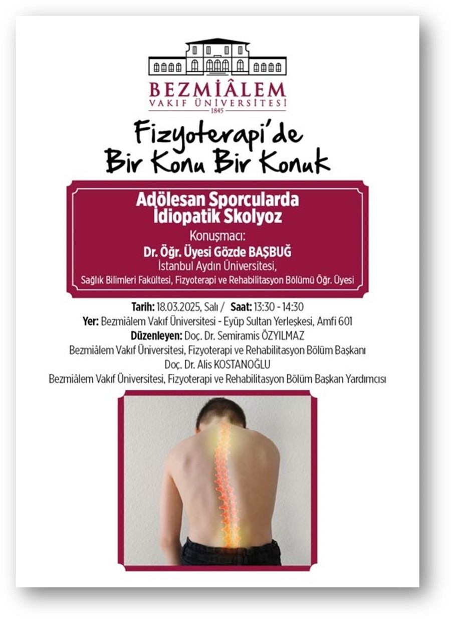 Bezmiâlem Vakıf Üniversitesi Fizyoterapi ve Rehabilitasyon Bölümü tarafından düzenlenen “Fizyoterapi'de Bir Konu Bir Konuk" etkinliği kapsamında, Dr. Öğr. Üyesi Gözde Başbuğ bizlerle buluşarak “Adölesan Sporcularda İdiopatik Skolyoz" konusundaki değerli bilgi ve deneyimlerini paylaştı.