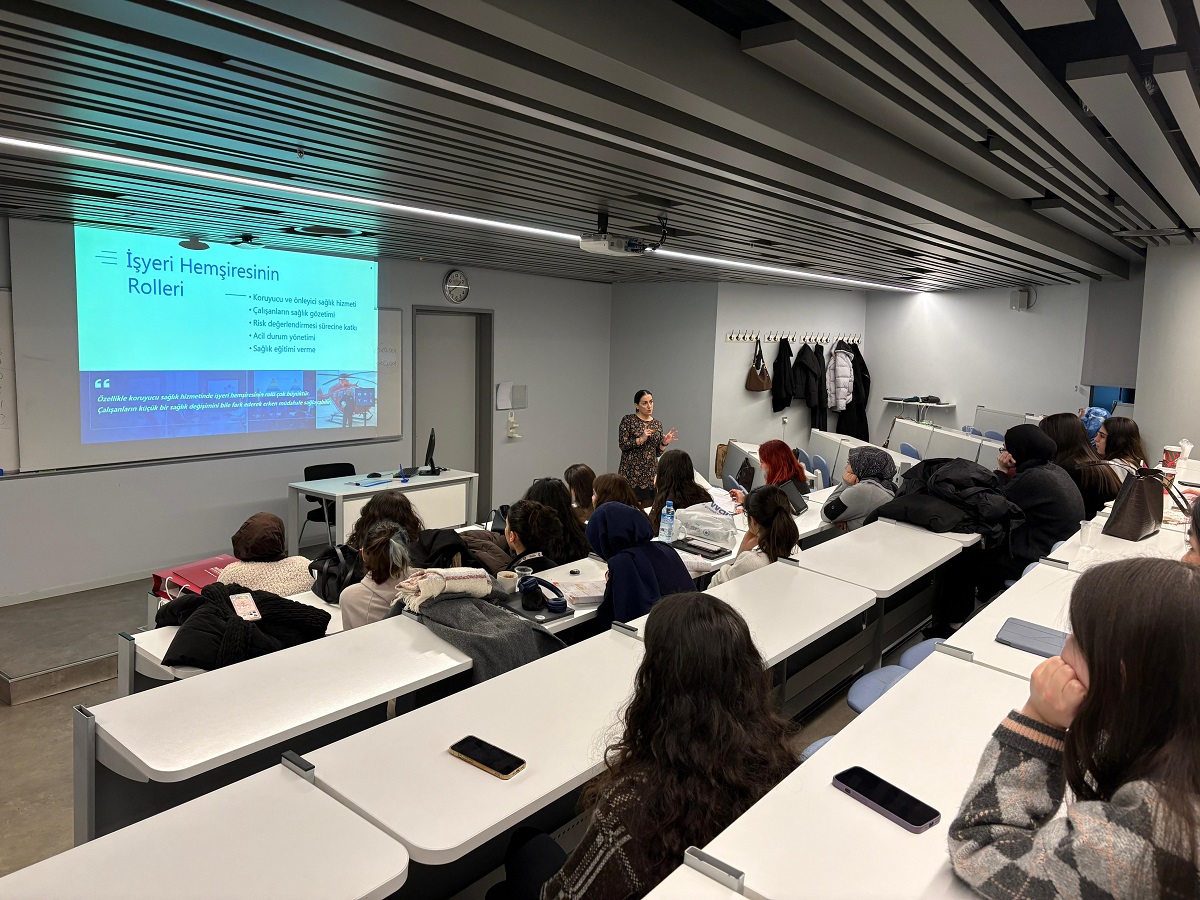 Konuşmasında, işyeri hemşiresinin görev, yetki ve sorumluluklarını mesleki deneyimleri ışığında paylaşarak, öğrencilerimize bu alana ilişkin kapsamlı bir bakış açısı sundu.