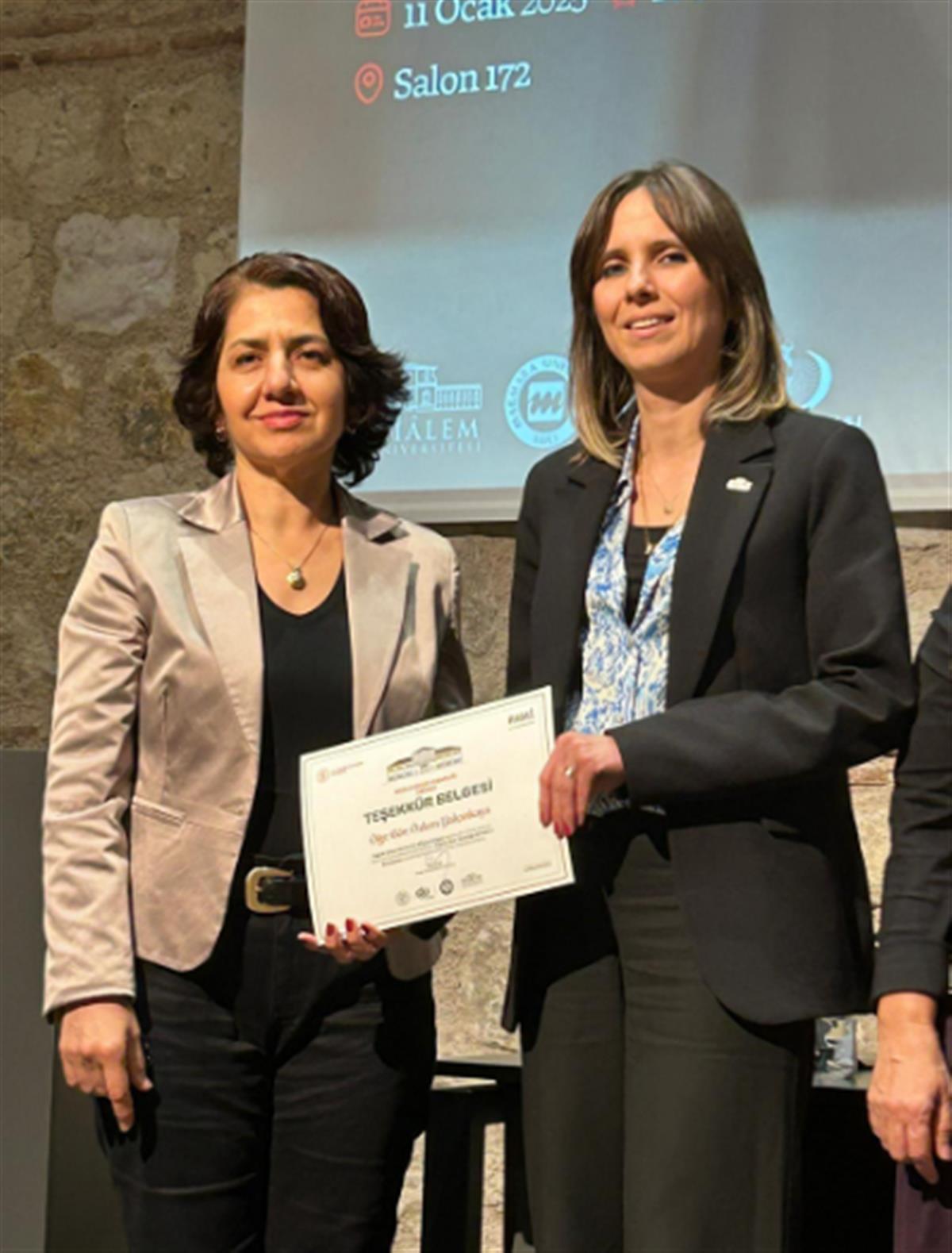 Panelin 3. Oturumunda Tıbbi Dokümantasyon ve Sekreterlik programı koordinatörü Öğr. Gör. Özlem Yalçınkaya “Sağlıkta Sürdürülebilirlik Bağlamında Tıp Kütüphanelerinin Rolü" başlıklı sunumunu; 4. Oturumda Tıbbi Dokümantasyon ve Sekreterlik programı öğretim elemanı Öğr. Gör. Deniz Eldeniz “Sağlıkta Elektronik Veri Tabanları Kullanımı ve Literatür Taraması" başlıklı sunumlarını gerçekleştirdiler.