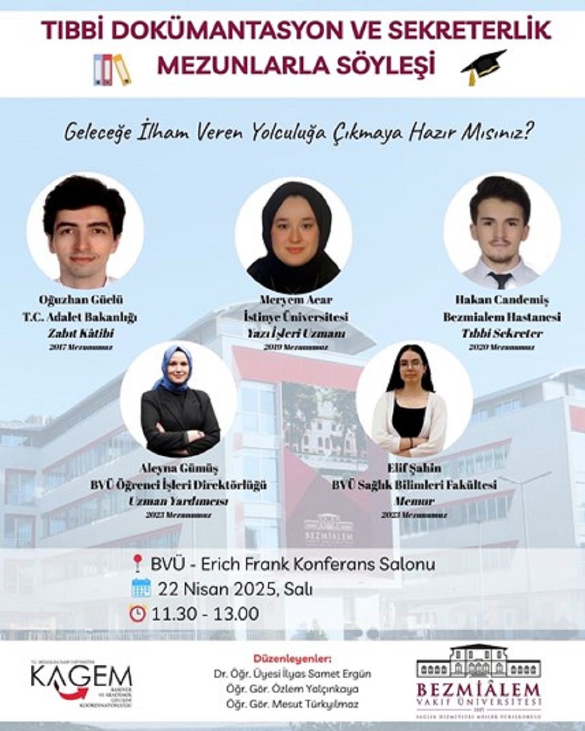 Üniversitemiz Kariyer ve Akademik Gelişim Koordinatörlüğü koordinasyonunda, Tıbbi Dokümantasyon ve Sekreterlik (TDS) Programı mezunlarının katılımıyla 22 Nisan 2025 tarihinde gerçekleşen “Mezunlarla Söyleşi" etkinliği başarıyla tamamlandı. Etkinlikte mezunlarımız, eğitim süreçlerinden mesleki deneyimlerine, sağlık sektöründeki güncel uygulamalardan kariyer planlamalarına kadar pek çok konuda bilgi ve tecrübelerini öğrencilerimizle paylaştı. Katılımcı öğrencilerimizin yoğun ilgi gösterdiği söyleşi, mezun-öğrenci etkileşimini güçlendirirken, kariyer farkındalığının artırılmasına da önemli katkı sağladı. Etkinlik sonunda mezunlarımıza değerli paylaşımları için teşekkür edilerek, bu tür buluşmaların sürdürülebilir şekilde devam edeceği vurgulandı.