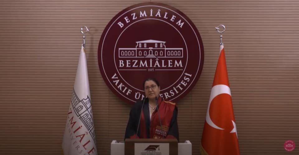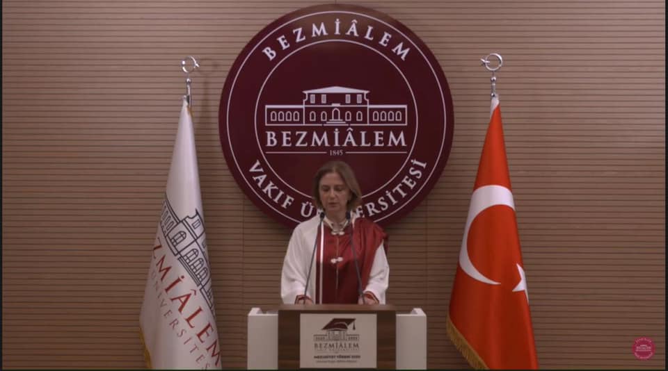 Mezuniyet Törenimizde Rektörümüz Prof. Dr. Rümeyza Kazancıoğlu mezunlarımıza seslenerek bir açılış konuşması gerçekleştirdi. Rektörümüz "Sağlık Hizmetleri Meslek Yüksekokulu'muzda geçirdiğiniz bu kıymetli eğitim öğretim süreciyle Bezmiâlem Ailesi'nin bir ferdi olan siz değerli öğrencilerimizin, bu yoldaki azminizi mesleğinizde de sürdürmeniz en büyük arzumdur. Dilerim eğitim öğretim sürecinde sizlere kurumumuzun kurucusu her daim hayırla yâd ettiğimiz Bezmiâlem Valide Sultan'ın bizlere emanet ettiği vakıf ruhunu hissettirebilmiş, iyi bir sağlıkçı ve her şeyden önce iyi bir insan olarak hayatınızda yer etmiş ve sizlere özellikle gerçekleştirdiğimiz tüm uygulamalar ile örnek olabilmişizdir" dedi.