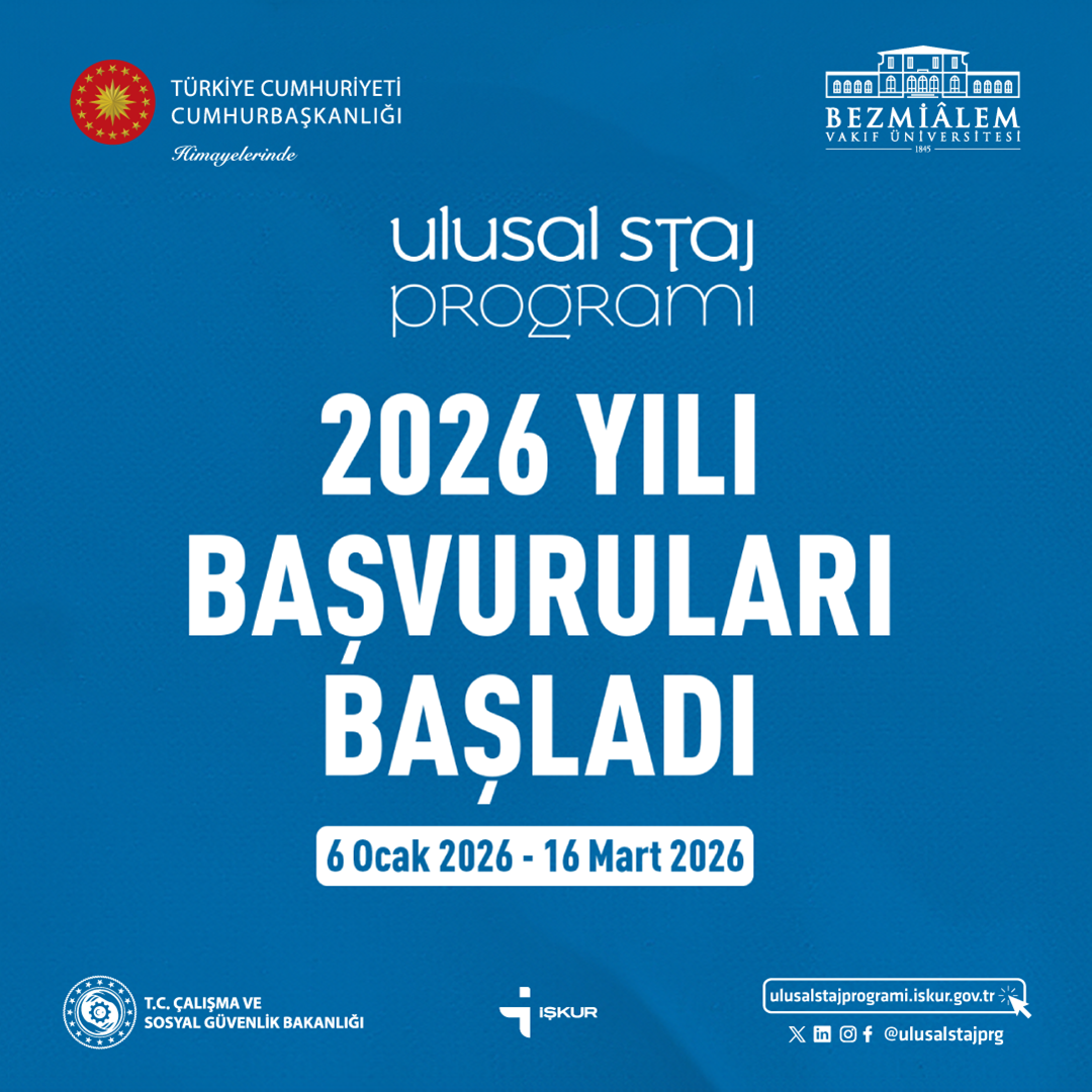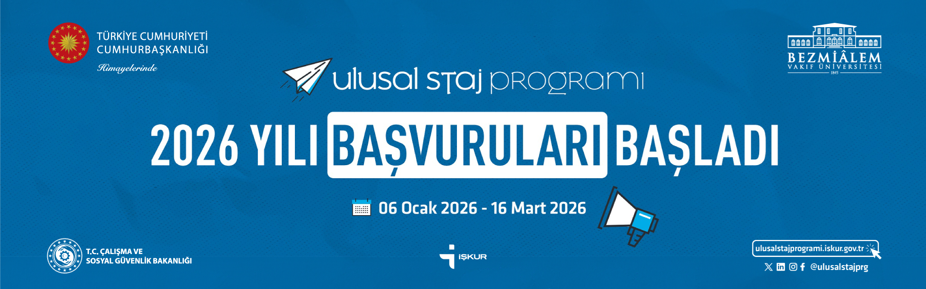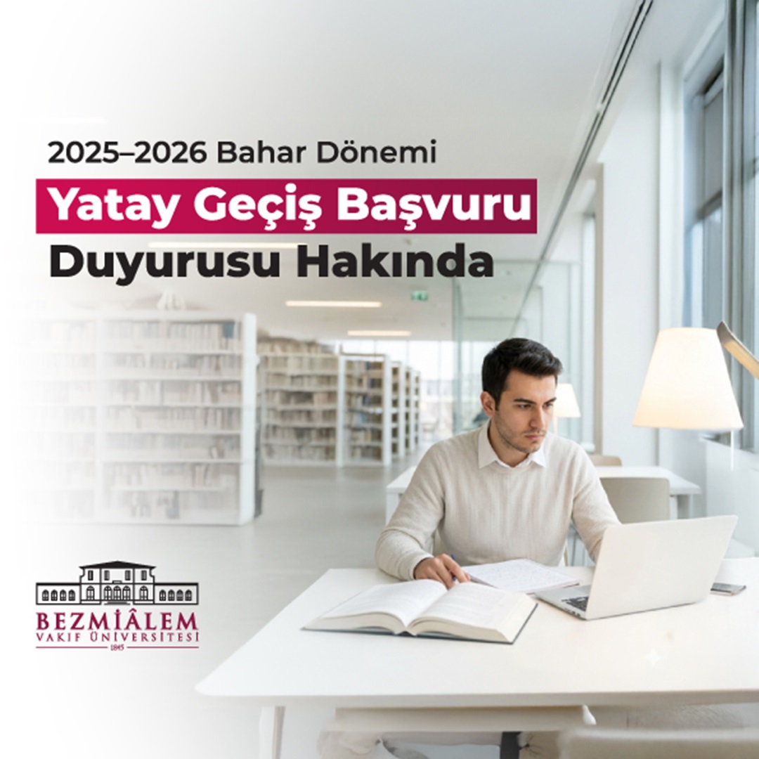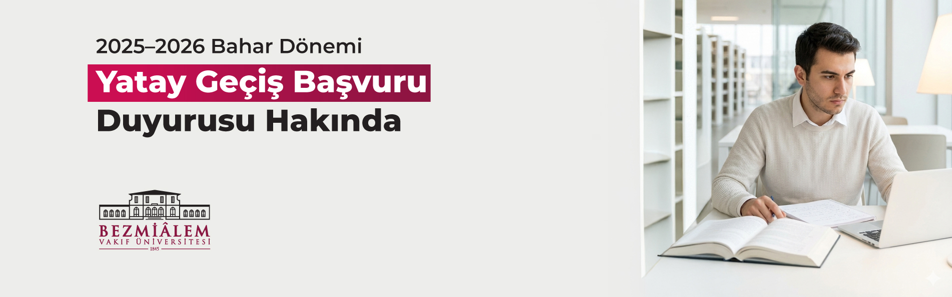 × Akademik Takvim Öğrenci Bilgi Sistemi BILSAB Teknoloji Transfer Ofisi Uluslararası İlişkiler Ofisi Fitoterapi Merkezi Sürekli Eğitim Merkezi Kütüphane DUYURULAR 14.01.2026 Ulusal Staj Programı 14.01.2026 2025-2026 Eğitim Öğretim Yılı Bahar Dönemi Yatay Geçiş Başvuru Duyurusu Hakkında... 08.01.2026 Üniversitemize Öğretim Üyesi ve Öğretim Elemanı Alınacaktır 15.01.2026 Türk Standartları Enstitüsü (TSE) tarafından “Genel Metroloji Eğitimi” Gerçekleş... TÜM DUYURULAR HABERLER 16.01.2026 YÖK Dış Danışma Kurulu Toplantısı Gerçekleştirildi 16.01.2026 Uluslararası Heyetten Üniversitemize Akademik İş Birliği Ziyareti 7.01.2026 Geriatrik Bireylere Yönelik İşitme Taraması Uygulaması Gerçekleştirdik TÜM HABERLER Burak ETKİNLİKLER Tüm Etkinlikler 13 Ekim 17:00 Aile Danışmanlığı Uzmanlık Sertifika Programı 1 Kasım 00:00 Anatomide Diseksiyon Aletleri ve Kullanım Becerisi 6 Aralık 00:00 Temel İşaret Dili Eğitimi Sertifika Programı 10 Ocak 00:00 Hastanelerde Sağlık Yöneticiliği Sertifika Programı VİDEOLAR Tüm Videolar Bezmiâlem Vakıf Üniversitesi | Tanıtım Filmi REKTÖRÜMÜZDEN MESAJ VAR: YKS 2025'E GİRECEK TÜM ÖĞRENCİLERİMİZE BAŞARILAR DİLERİZ Neden Bezmialem? Çünkü Gelecek Sağlıkta! Sıra Sende! Geleceğin Eczacıları Bezmialem’de Yetişiyor | Prof. Dr. Binnur Temel Anlatıyor Bezmialem'den Johns Hopkins’e: Tıp Öğrencisi Hümeyra Şahin’in Uluslararası Staj Deneyimi Bezmialem’de Diş Hekimliği: Geleceğe İz Bırakan Eğitim | Prof. Dr. Mehmet Burak Güneşer Anlatıyor Gençlerde Kalp Krizi Riski | Bilim Kafe | TRT HABER & Bezmialem Vakıf Üniversitesi Tıp Fakültesi – Doç. Dr. Fatma Ateş, Bezmialem Vakıf Üniversitesi'ni anlatıyor Rektörümüz Prof. Dr. Adem Akçakaya CNN Türk’te | Tercih Zamanı 2025 Modal title BEZMİALEM'İ KEŞFET Tüm Tarihçeyi Gör 1845 Osmanlı'nın İlk Modern Hastanesi Kuruldu 1903 İlk Modern Ameliyathane Açıldı 2010 Bezmiâlem Vakıf Üniversitesi Açıldı