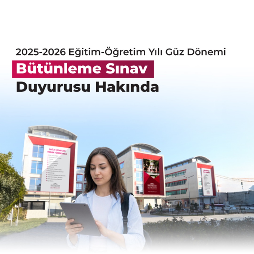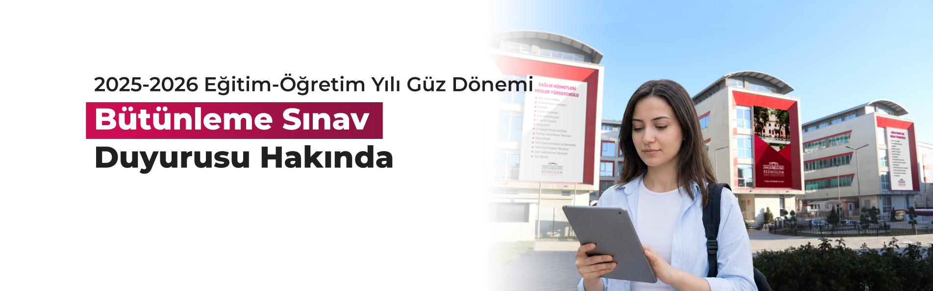 HABERLER TÜM HABERLER NEWS All NEWS “Öğretmeye Gönül Verenler” Programı Gerçekleştirildi Ön Lisans Sağlık Programlarımız MEDEK ile Akredite Bezmialem’den Doç. Dr. Beyza Göncü’ye TÜSEB Aziz Sancar Teşvik Ödülü TÜM HABERLER DUYURULAR TÜM DUYURULAR ANNOUNCEMENTS 20.01.2026 2025-2026 Eğitim-Öğretim Yılı Güz Dönemi Bütünleme Sınav Takvimi Yayımlandı 19.12.2025 2025 2026 Güz Dönemi Final Sınav Takvimi 18.11.2025 Beyaz Önlük Giydirme Ve Beyaz Yaka Töreni 21.11.2025 2025-2026 Eğitim-Öğretim Yılı Güz Dönemi Mazeret Sınav Takvimi ALL ANN TÜM DUYURULAR